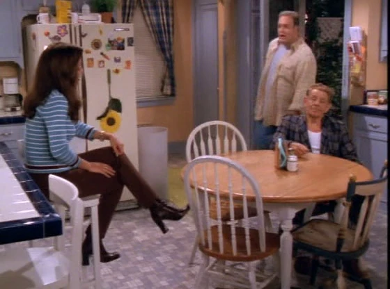 While they watch TV, Doug keeps on changing the channel and it annoyings the guys then finaly he keeps it on the news wanting to learn somthing. Richie then talks to Deacon and asks if he'll "do Hillary"(refering to Hillary Clinton) and they have a converstation about it. Carrie lets Doug know that they have to leave and as they go Deacon tells Doug that he's whipped and Spence says it as well and then Richie states that he still lives with his mom. Doug asks Carrie if she wants to have some wine but Carrie says that they have to have dinner at her father's. Doug begs her not to go, as he talks Carrie into cancelling the dinner and it skips to them watching the big T.V. in the basement. Doug is playing with the remote and Carrie if he wants to have sex and he says yes and as they start to go someone bangs hard on there door and they go anyway but Carrie decides she will get the door but Doug says he will get it so he goes up and it's Sara (Carrie's sister) and she is very panicked and Doug closes the door but through the mail slot Sara states that Tessie (Sara's mother and Arthur's wife) died. She explains that when she come home from acting class and Arthur told her that she died from a heart attack and they continue to talk while the door is still closed and Sara says that she is wet because his sprinkler came on.